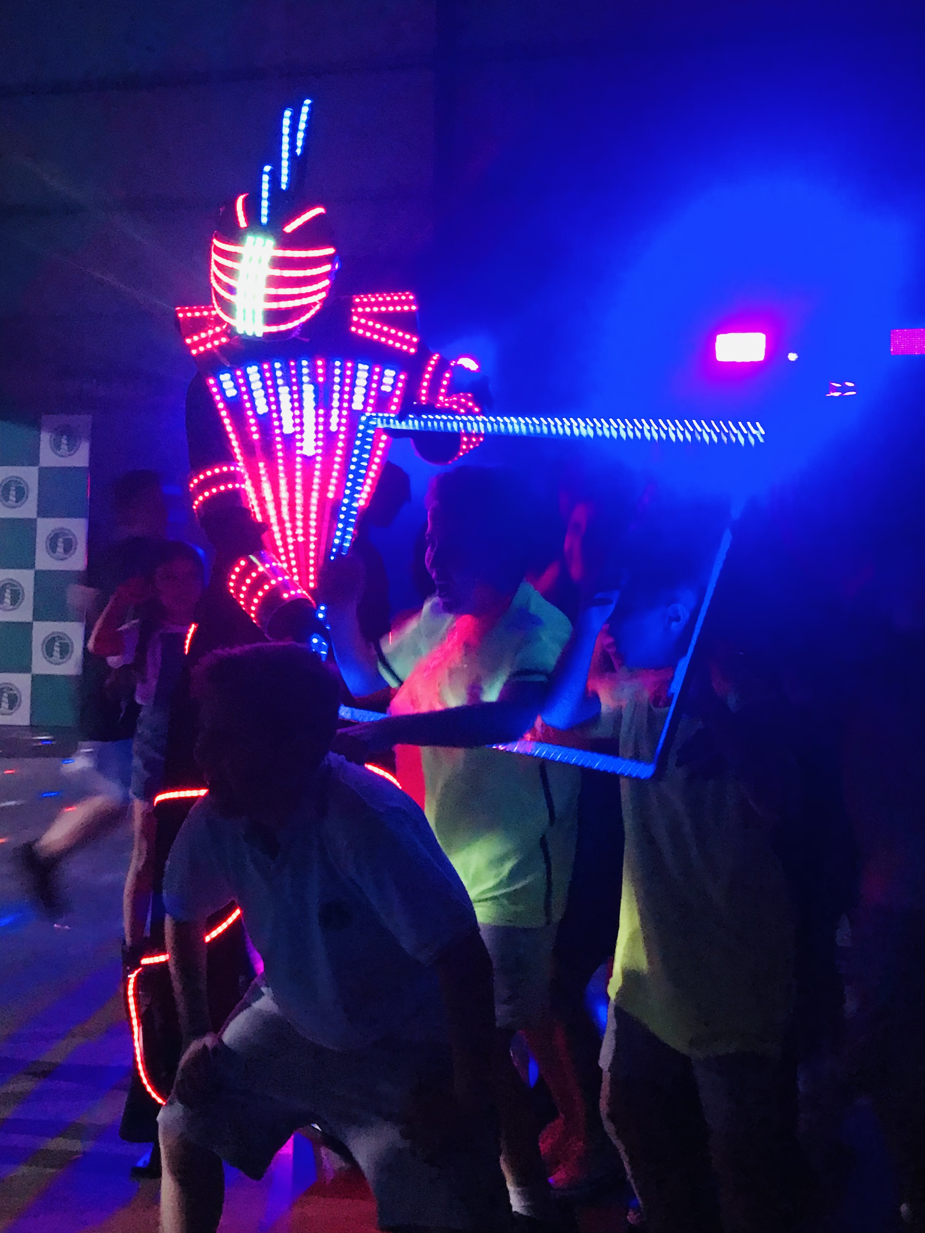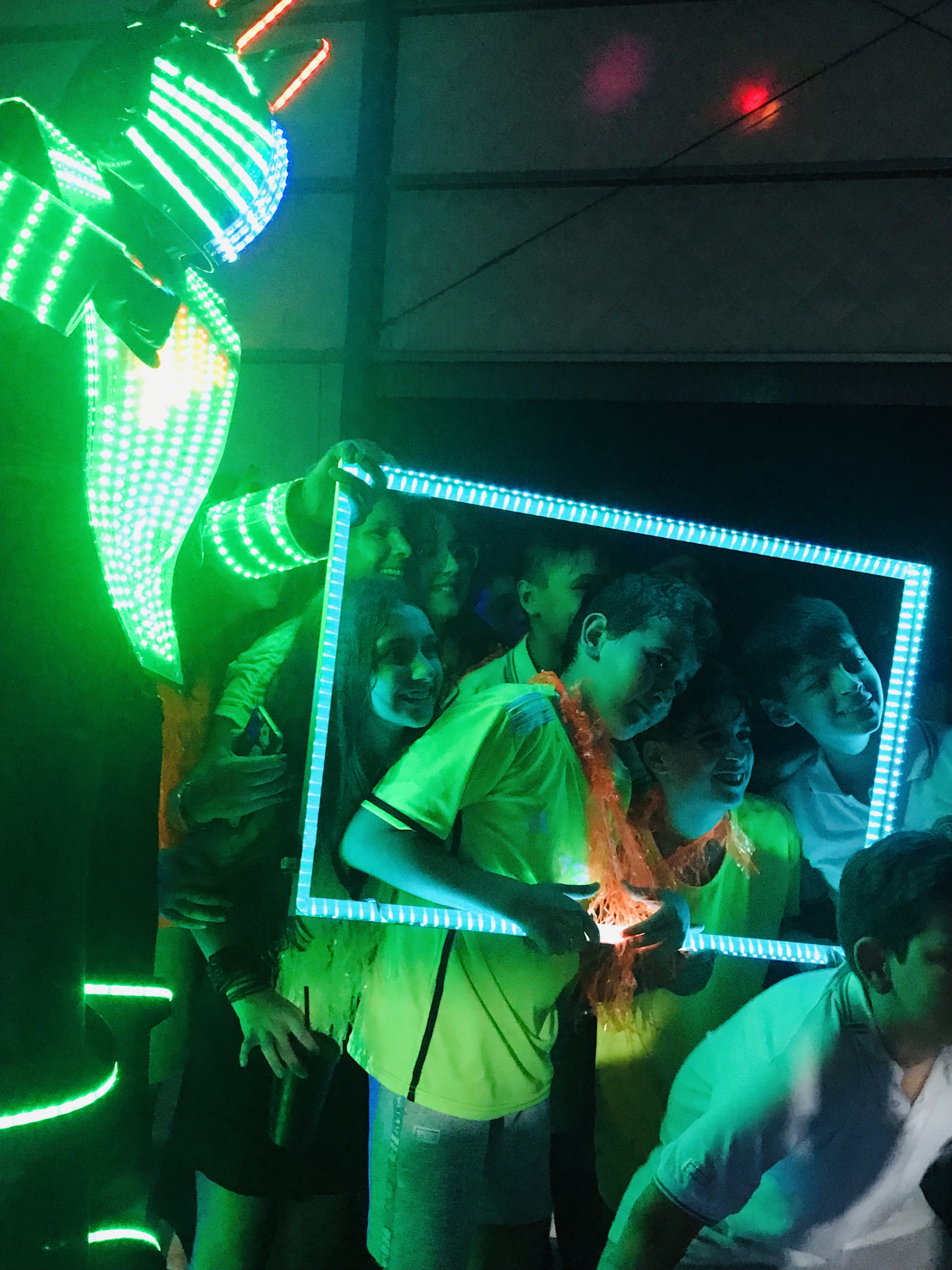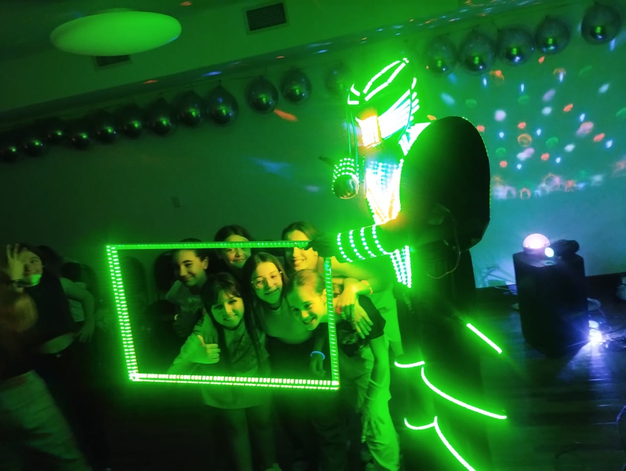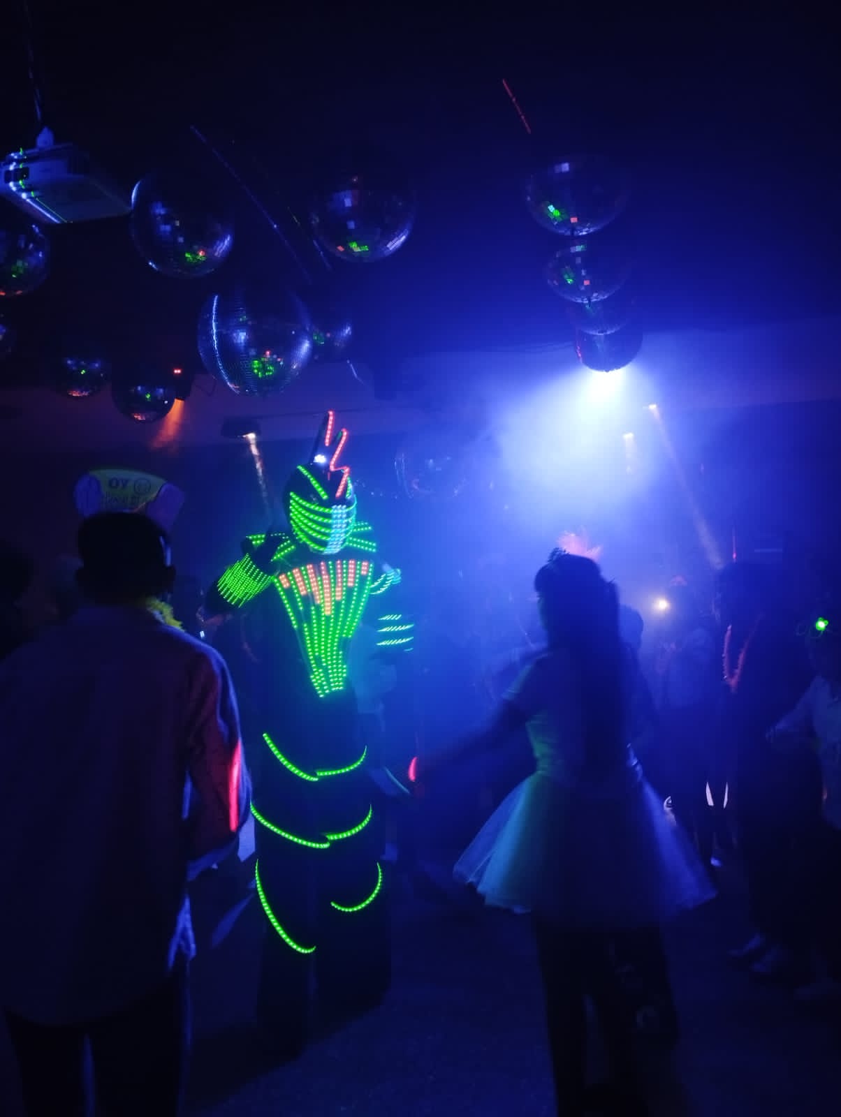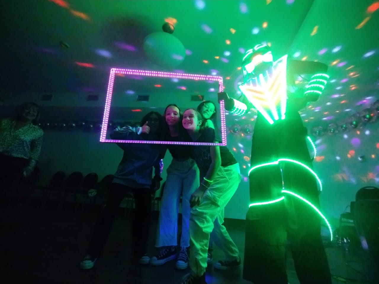 Robot con zancos - Cuadro led para fotos- Limbo luminoso -Chispas Frias - Su propia música mezclada por DJ.
