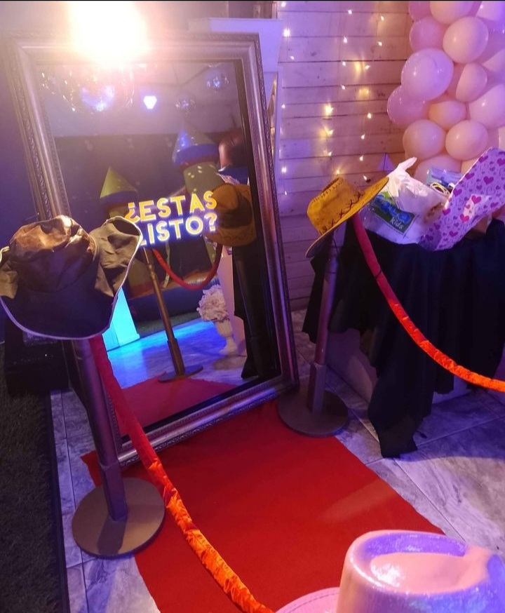 Tocas el espejo, te sacas 3 fotos, escribis una dedicatoria con tu dedo en la pantalla y te llevas la foto impresa de 10x 15 cm en el momento.