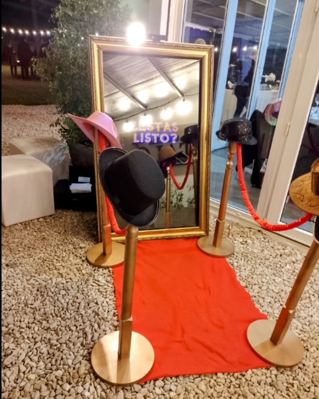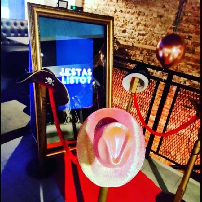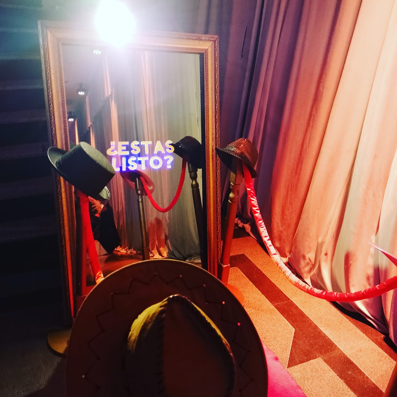 El espejo saca 3 fotos de cuerpo en horizontal con efectos Snapchat, entre foto y foto ánima a los invitados